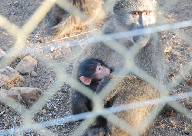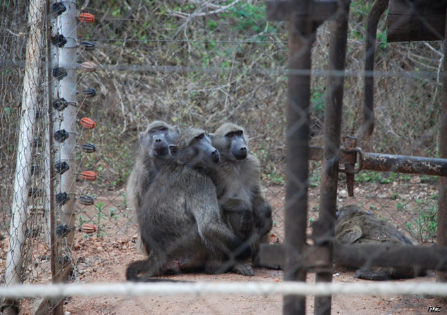 Days start with bottle feeding the younger babies. They would jump in your arms and grab the bottles and suck the milk swiftly. Mathyou, the older and stronger baboon baby, would empty his bottle first and steal Hallen's one, just because if he'd tried Queeny's she'd scream so badly that even he'd give up on the idea. The other find shelter on our hands.